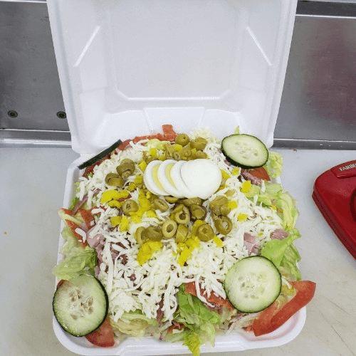 Hickory smoked ham, pepperoni, salami, provolone cheese, banana peppers, and green olives on a fresh bed of salad greens
