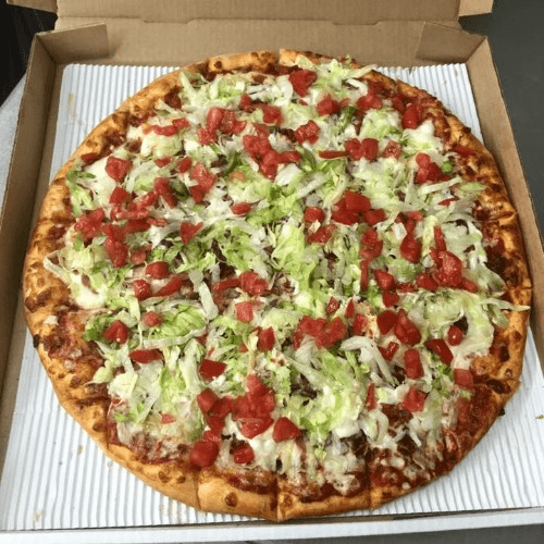 Joe's brother David loves this one! Our special pizza sauce, fresh provolone cheese, bacon crumbles, and hickory smoked ham - after it's baked it is topped with a creamy mayo based dressing, crisp lettuce, and diced vine-ripened tomatoes